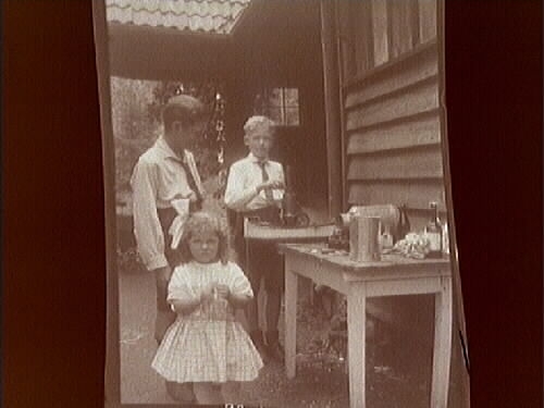 Två pojkar och en flicka vid sommarbostaden.
