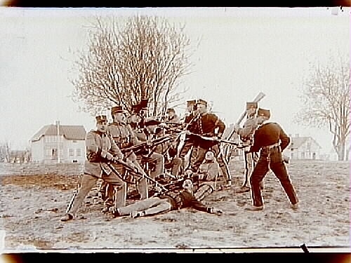 Soldatgrupp, 16 soldater som bajonettfäktas.