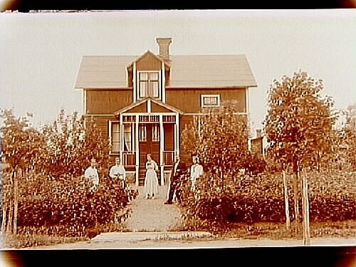 En och en halvvånings bostadshus med frontespis och veranda, 5 personer framför huset.