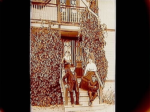 En och en halvvånings bostadshus, vinkelbyggt, med balkong och veranda, familj 5 personer på verandatrappan.
