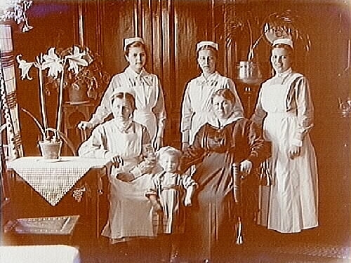 Örebro Privata Förlossningshem, interiör, fyra barnsköterskor, en kvinna och ett barn.