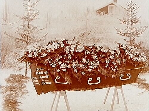 Begravning, likkista med locket på, kransar och buketter. Kistan står ute på bockar.