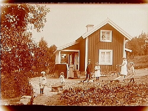Sommarstugan Fridensborg, envånings sommarstuga med inredd vind och veranda. Fyra barn och tre vuxna framför stugan.