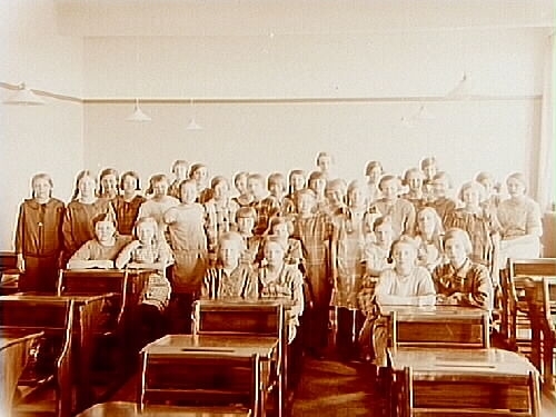 Engelbrektsskolan, klassrumsinteriör, 35 skolflickor med lärare, klass 6, sal 23.
