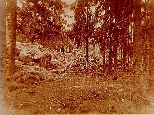 Naturbild, med texten: Fronten av Bergtjärnsfallets blockström. I förgrunden "stenläggning" med rullblock av lägre klass, över vilka avlastningstippen av grovblock varit på väg att utbyggas vidare.