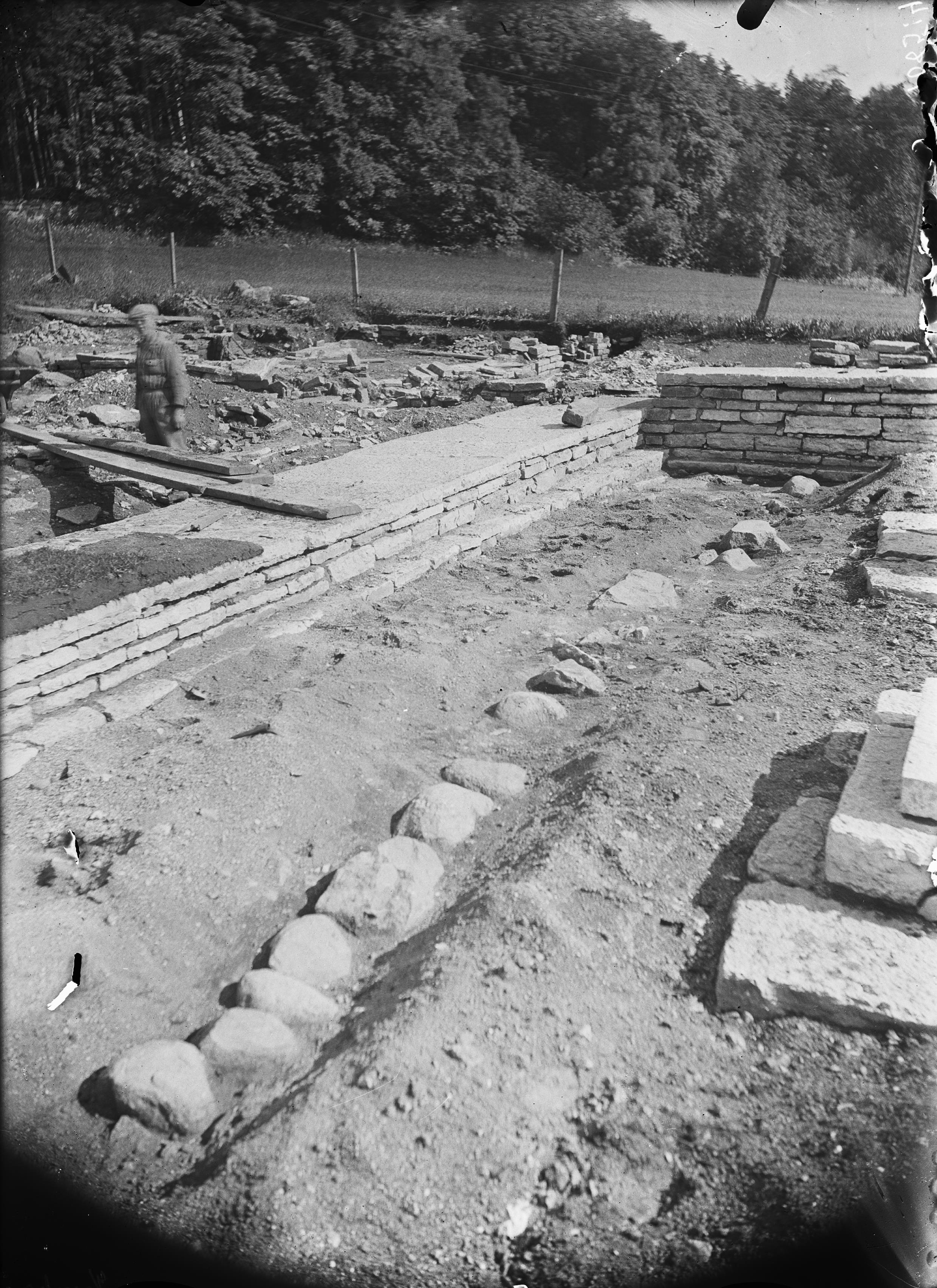Rester av äldre grundmur kanske till trähus, under reflektoriets golvnivå.Fr n.n.v.