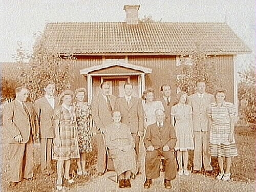 En och en halvvånings bostadshus med förstebro. Tretton personer framför huset.
