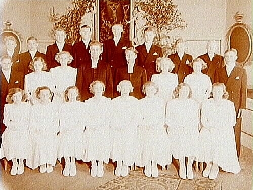 Tolv flickor, tio pojkar och pastor Hilding Hasselmyr och pastor Lagerstedt (O.P. kyrkan)