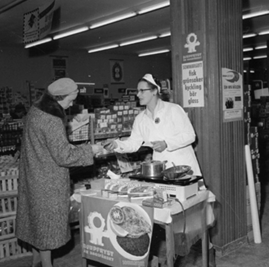 Konsum snabbköp, affärsinteriör, kunder och personal, demonstration av djupfryst mat.