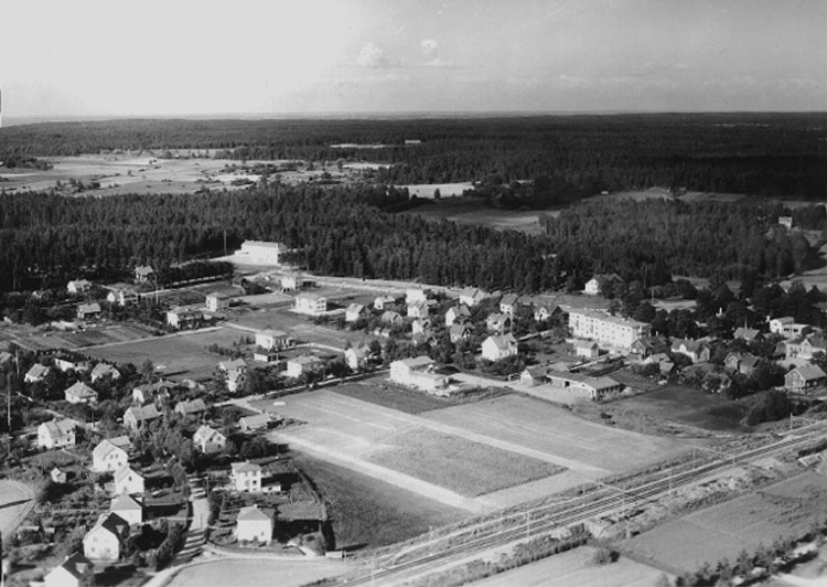 Titel: Flygfoto över Pålsboda. Bilden tagen för vykort. Förlag: Thryggs Bokhandel, Pålsboda.