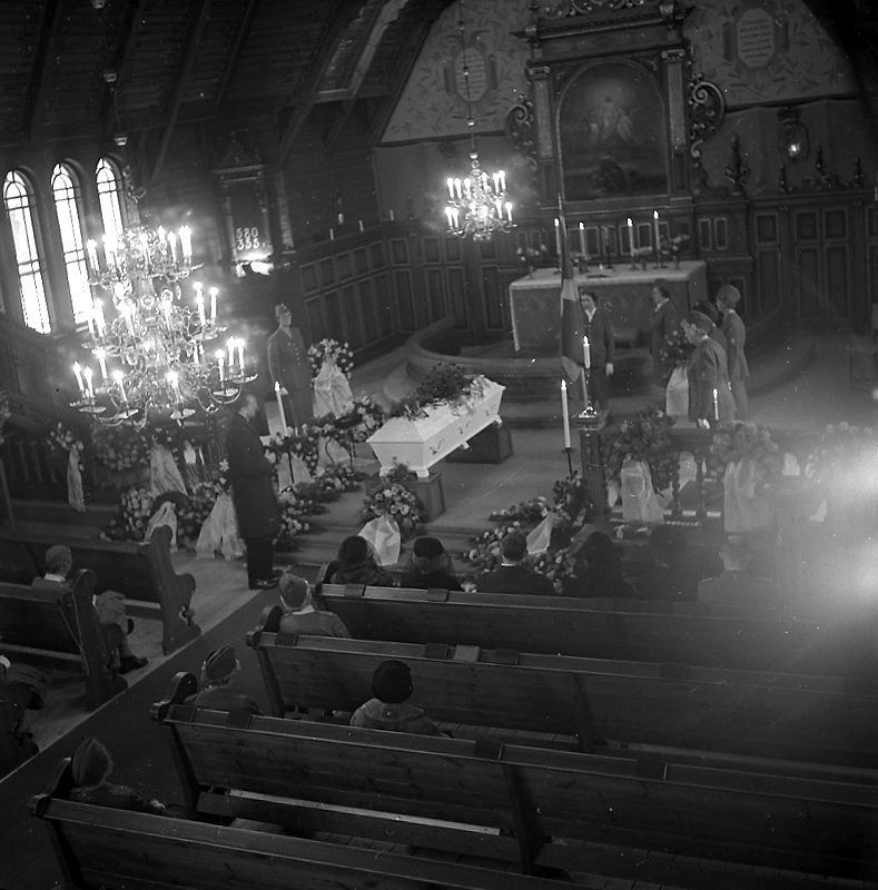 Begravning i Ljusnarsbergs kyrka, interiör av kyrkan, likkista, präst och människor.