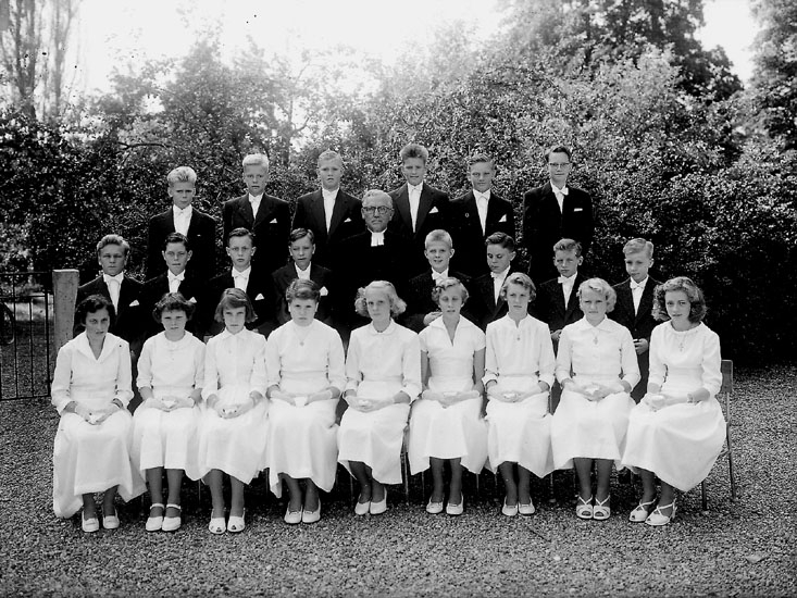 Konfirmander, 9 flickor, 14 pojkar och kyrkoherde Gunnar Johansson.