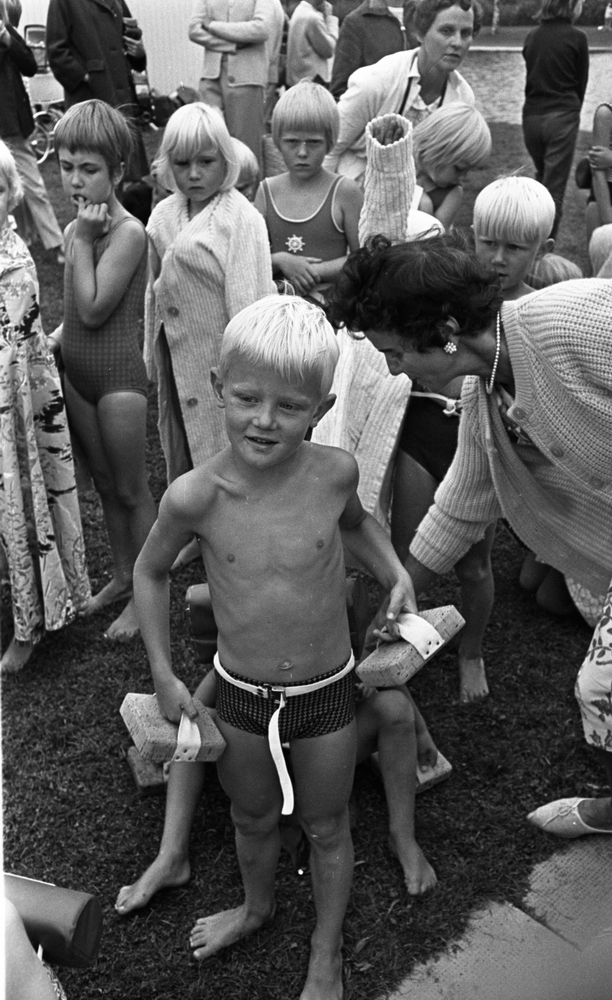 Simskoleavslutning, barn och föräldrar i kö. Pojken i förgrunden håller korkdynor i händerna