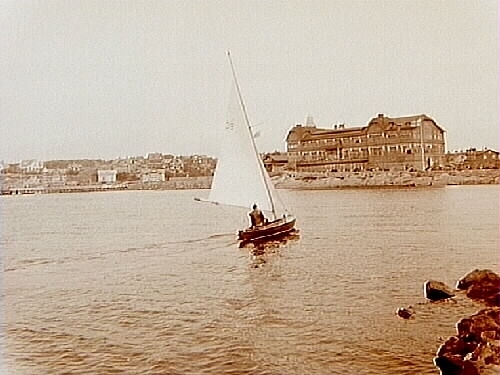 Långedrags restaurang, tvåvånings restaurangbyggnad. Segelbåtar.