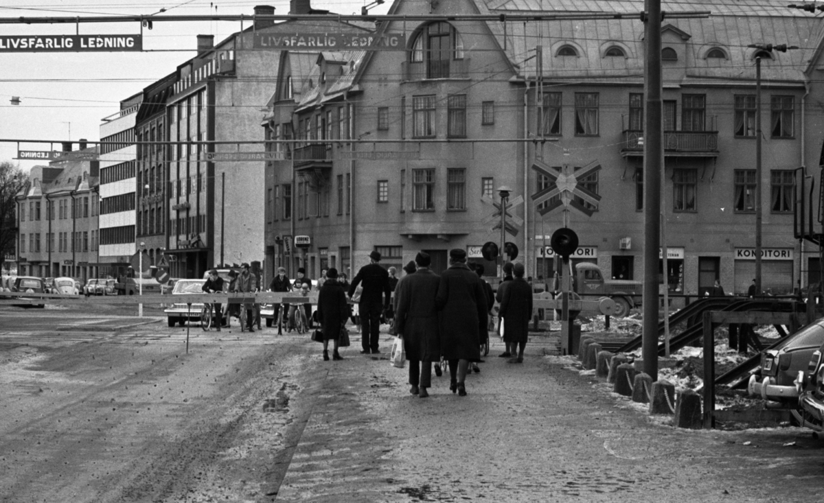 Folk väntar på att tåget skall passera nedfälld järnvägsbom.