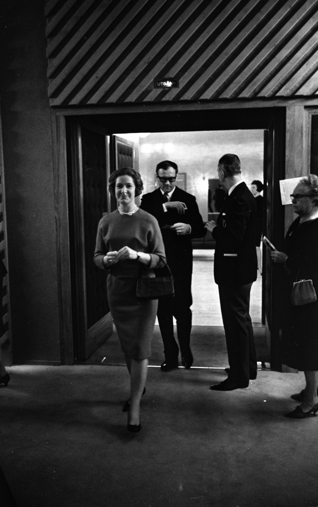I förgrunden ser man en kvinna komma gående inne i teatern. Hon är finklädd i klänning. Strax höger om henne står en äldre dam. Bakom den förstnämnda kvinnan står två kostymklädda herrar. Båda kvinnorna har varsin handväska hängande över vänstra armen.
