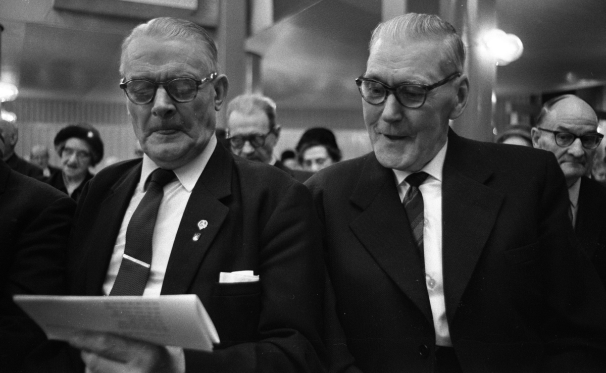 I förgrunden på bilden syns det två herrar som sitter bredvid varandra. Båda bär glasögon och är klädda i mörka kostymer, ljusa skjortor med mörk slips. Herren som sitter till vänster på bilden håller i sin vänstra hand ett sånghäfte. Han sjunger. I bakgrunden på bilden skymtar det andra herrar och damer. Damerna på bilden bär glasögon och har hattar på sig.
