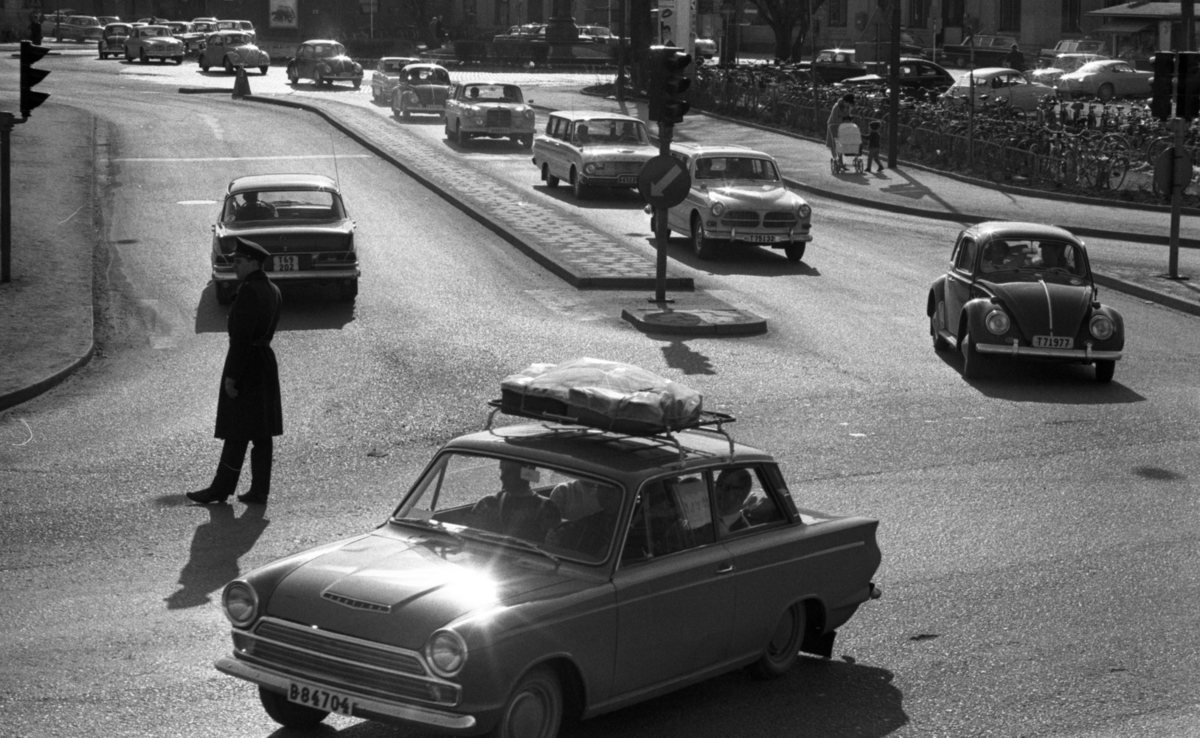 Polis dirigerar trafiken vid centralstation. Ford Cortina, Ford Falcon, Amazon, VW-bubbla, Mercedes