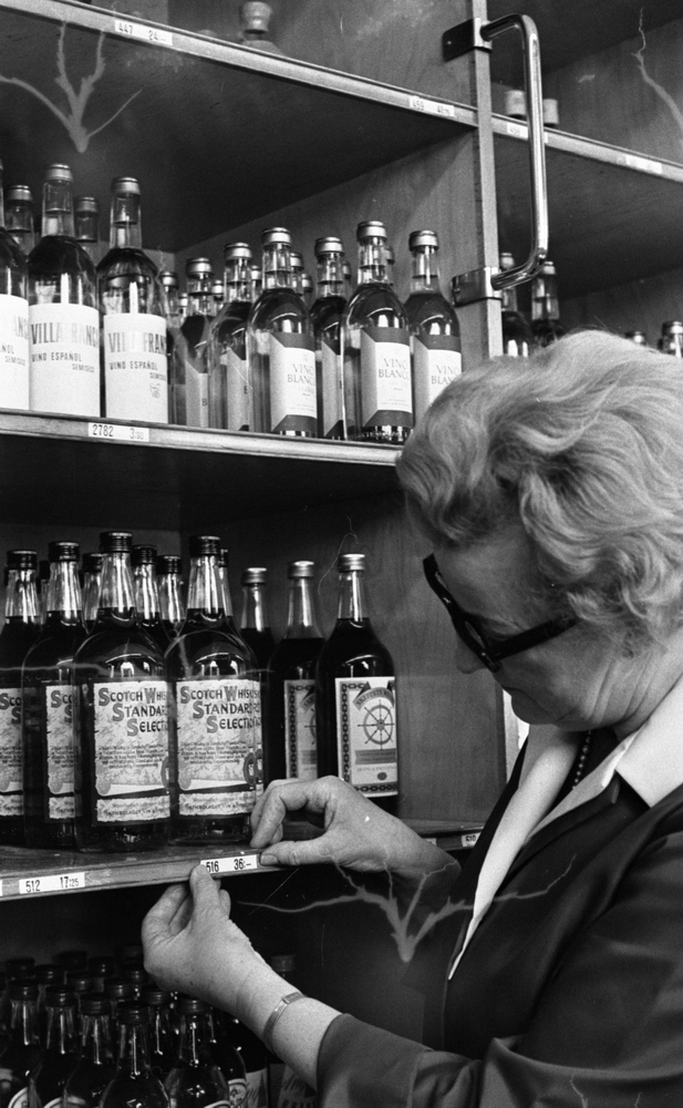 En kvinna som arbetar på Systembolaget klistrar upp en liten etikett med nummer och pris på whiskyflaskor som står på en hylla. Andra flaskor står på hyllor runtomkring. Kvinnan är klädd i arbetskläder.