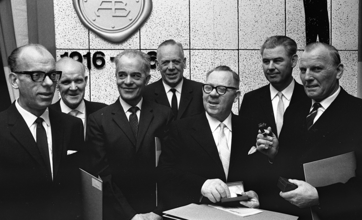 Sju stycken herrar i svarta kostymer och vita skjortor står tillsammans. Herrn längst till höger håller ett svart armbandsur i sin högra hand. I den vänstra håller han en liten svart smyckesask. Nära honom står ytterligare en man och håller i en smyckesask. Han gräver med högra handen i den. Det har skett en utdelning av guldur.