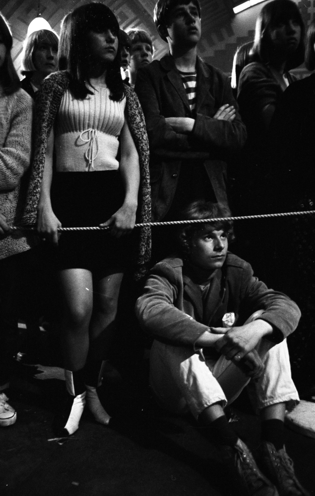 Närbild på en flicka och en pojke ur publiken. Flickan står upp och pojken sitter på golvet. Flickan är klädd i blus, kjol, kofta över axlarna samt stövlar. Pojken är klädd i kavaj och byxor.