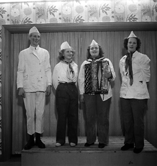 Titel: Konsums restaurang, interiör, personalfest, underhållning, fyra personer.