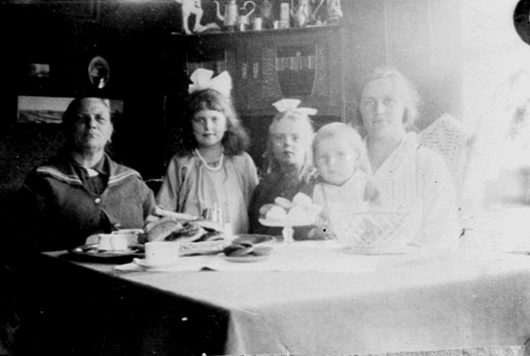 Rumsinteriör, familjegrupp fem personer vid bordet.