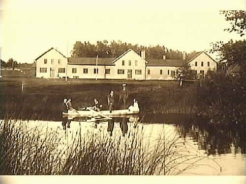 Fam. Sjöholm i aktern sitter fru Sjöholm med sonen ? vid årorna Nils och i fören dottern Thea. Står i ekan gör??? Sjöholm och på land stinsen Vikström.