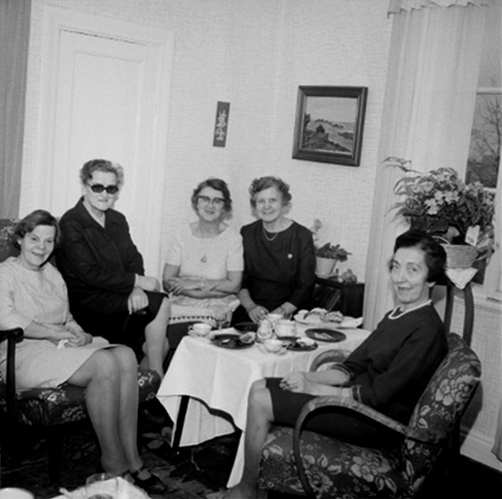 Rumsinteriör, fem kvinnor. Personalklubben uppvaktar Dagmar Larsson på 60-årsdagen.