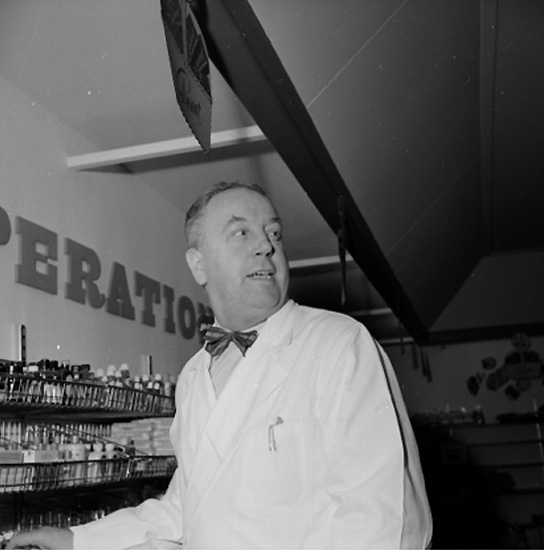 Konsum Tybble, affärsinteriör, en man ur personalen.
