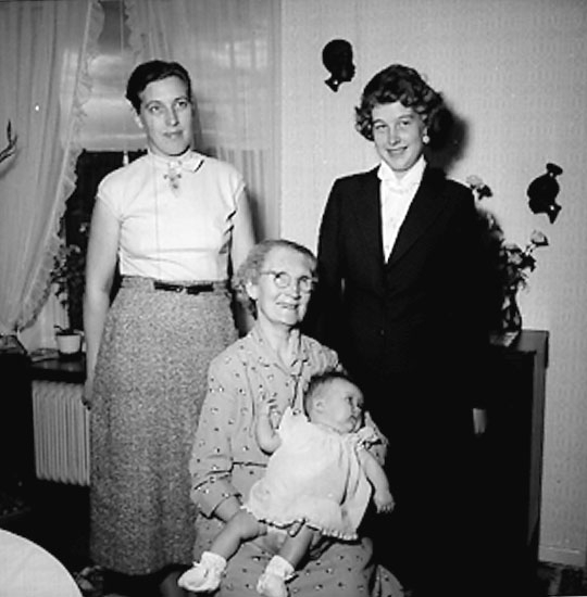 Rumsinteriör, släktgrupp fyra personer, fyra generationer.