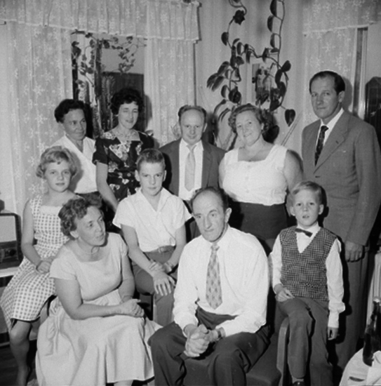 Rumsinteriör, släktgrupp tio personer, födelsedagsfirande.
