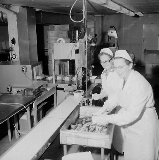 Konsum, interiör, packning av fisk, två kvinnor.