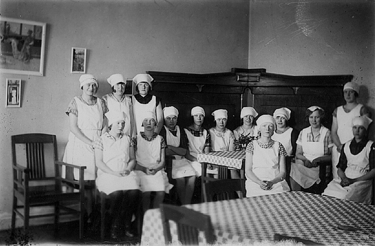 Skolkökskurs, grupp 13 flickor med lärarinna.