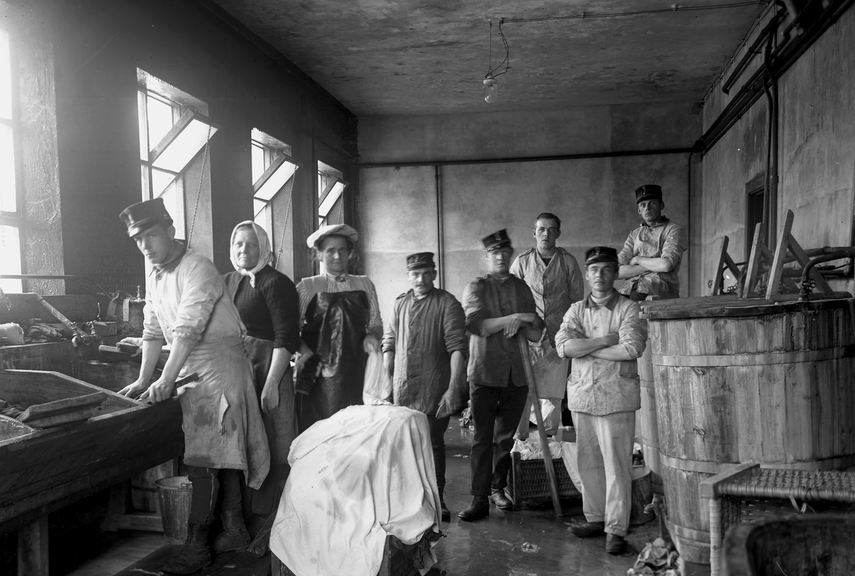 Kungliga Svea Trängkår, tvättstugeinteriör, 6 soldater och 2 kvinnor.