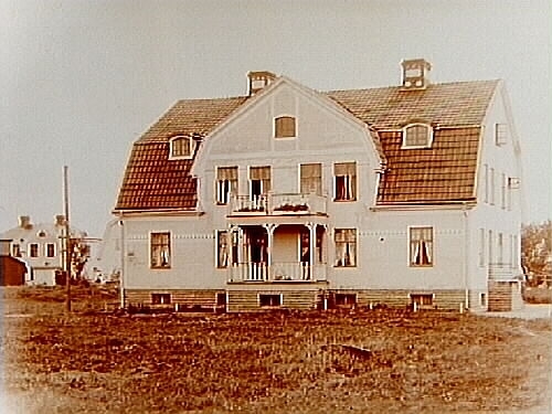 Envånings villa med inredd vind, frontespis, balkong och förstebro, brutet tak med fyra takhuvar.