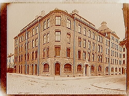 Johnson & Hill, fyra vånings fabriksbyggnad i rött tegel, ett torn, tornhuvar. Fastigheten ligger dels vid Klostergatan - Fredsgatan -Gamla gatan.