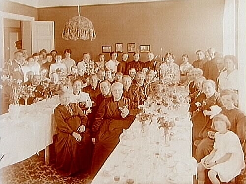 Rumsinteriör. Långt bord med födelsedagsbarn och gäster.