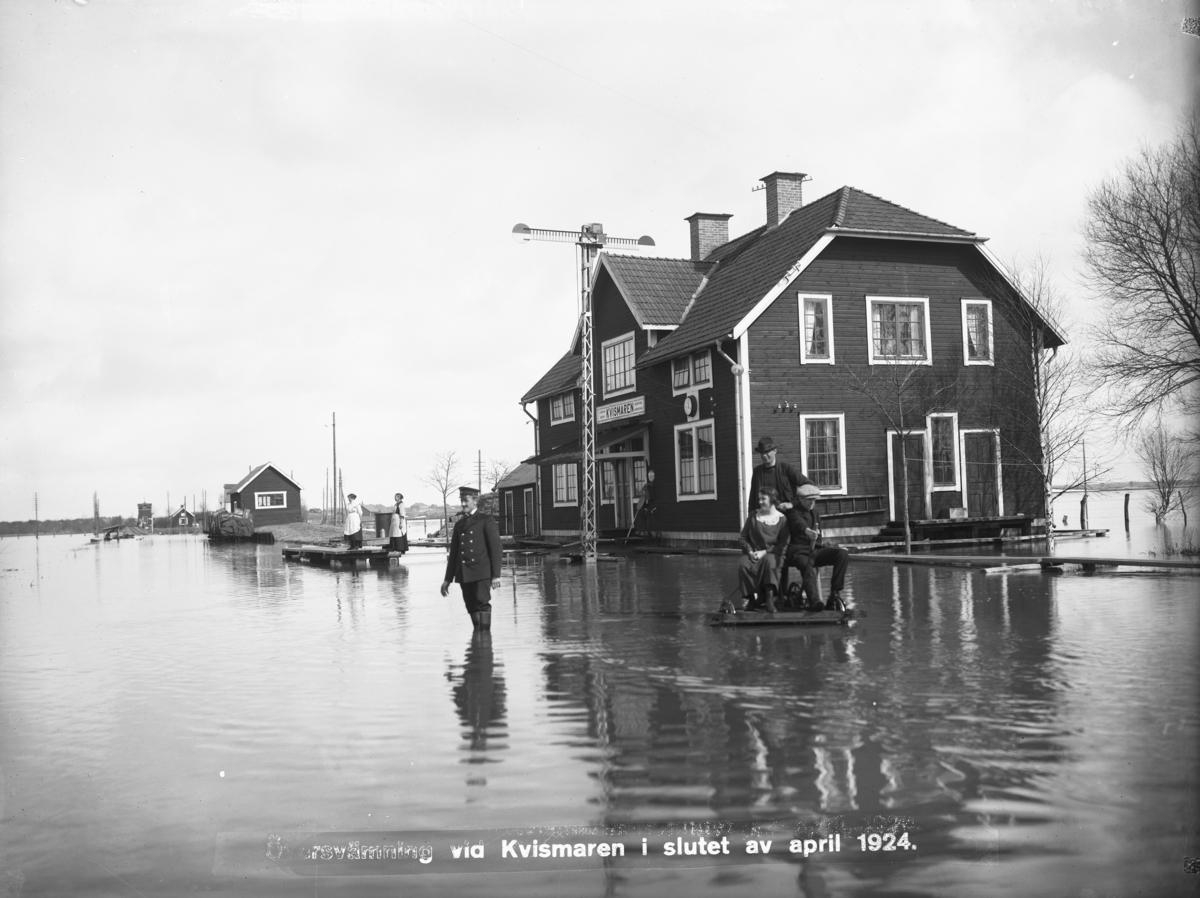 Kvismare järnvägsstation, tvåvånings stationsbyggnad med frontespis och brutet tak. Tre personer på en dressin. En stationskarl.