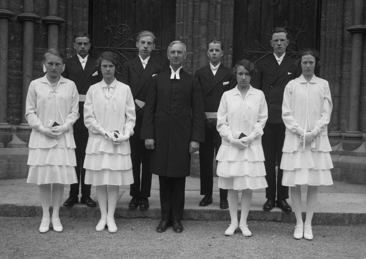 Konfirmander, 4 flickor, 4 pojkar och pastor Hilding Blix (född i Junsele 1881, död 1929) framför kyrkan.
