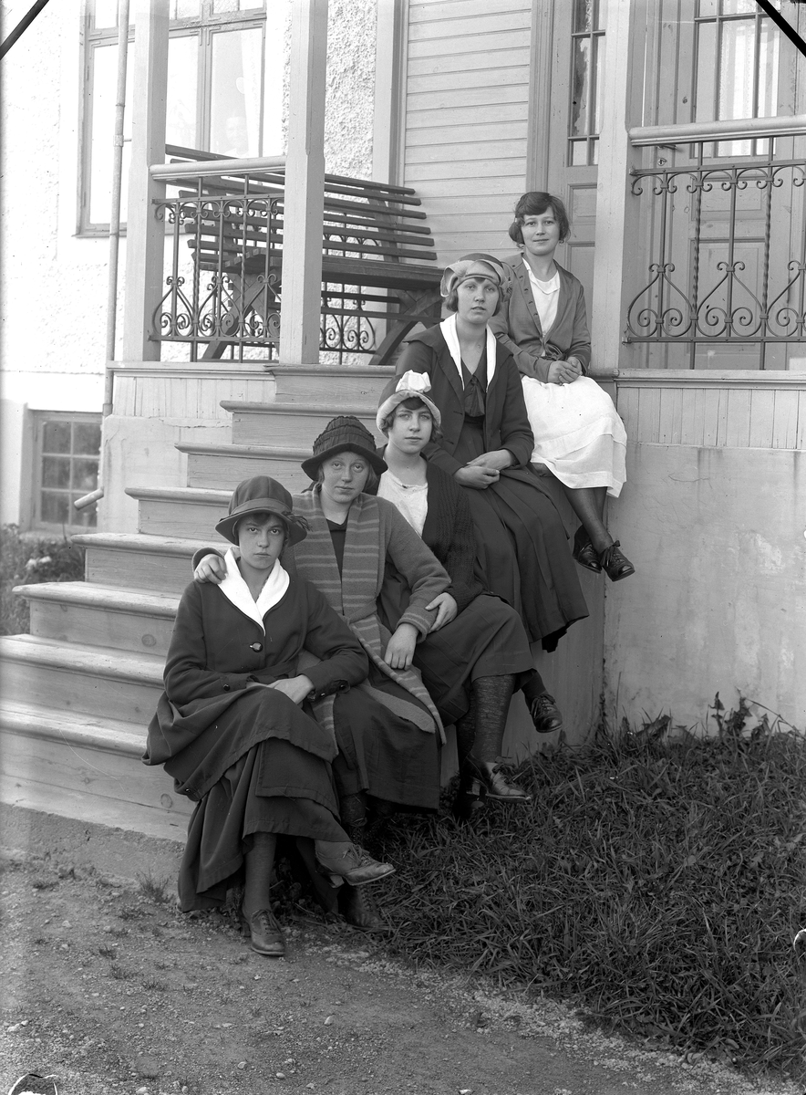 Bostadshus, fem kvinnor på trappan.