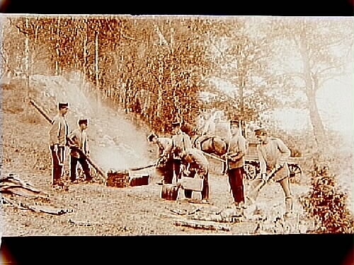 Landstormsofficerskursen, 7 män som hugger ved och en man som rider på häst som drar trilla.