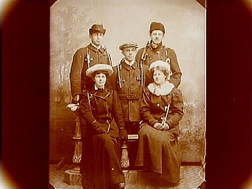 Fem personer, tre män och två kvinnor med skridskor om halsen.