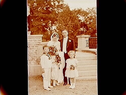 Brudpar med två brudnäbbar. Bruden helt i vitt, med lång slöja, brudgummen i frack.