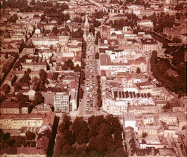 Flygfoto över Örebro, Nikolaikyrkan, byggnader.