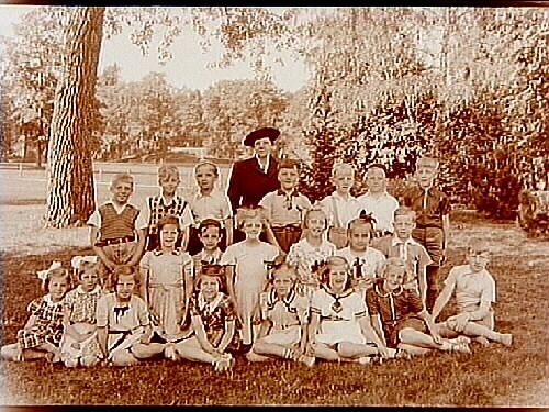 Engelbrektsskolan, 10 flickor och 10 pojkar med lärarinna fröken Astrid Vidén på skolgården. Klass 2, sal 16.