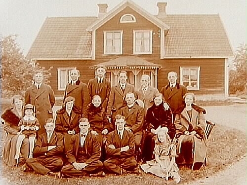 Släktgrupp 17 personer framför huset.