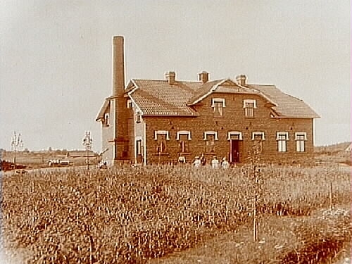 Stora Mellösa Mejeri, en och en halvvånings mejeribyggnad med hög skorsten, tegelbyggnad, 5 personer framför mejeriet.