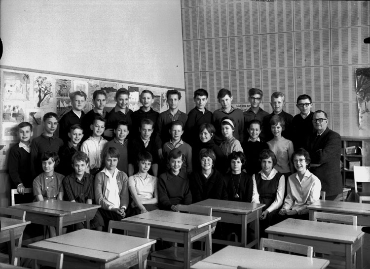 Vasaskolan, klassrumsinteriör, 30 skolbarn med lärare Bertil Berglund.