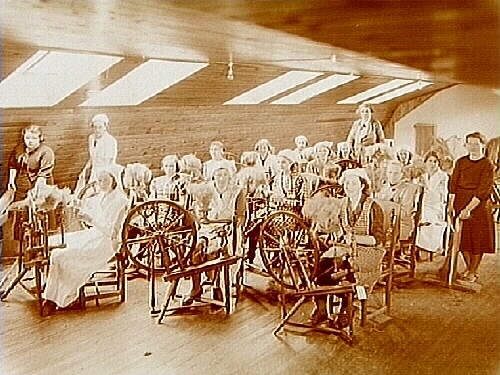 Kvinnor som spinner på spinnrockar, kardar och bråkar lin.